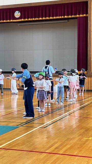 各班ごとにバーをハンドルに見立て、自転車を運転する際の交通安全について学んでいます。