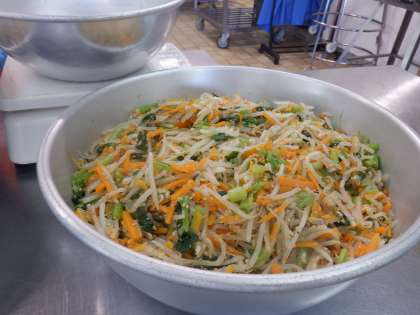 野菜と、肉(切干大根入り)を混ぜて食べます。たくさんの切干大根が入っているのでヘルシーです。