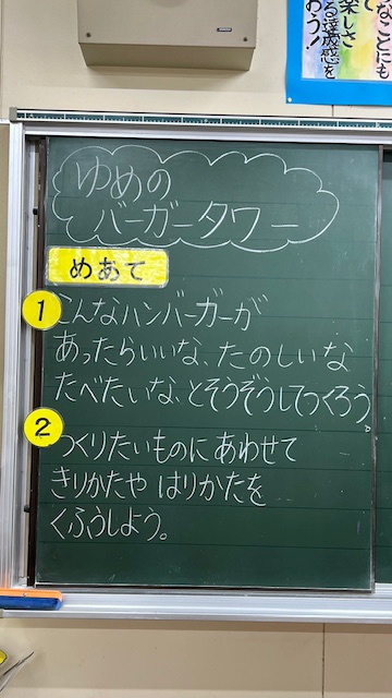 材料の切り方や貼り方を工夫して、「食べてみたい」「あったらいいな」と思うようなハンバーガータワーを作ります!