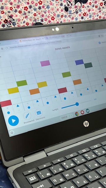 音の上がり下がりや音色を工夫して、短い旋律を作ります。お互いに聞き合い、感想を伝え合います。