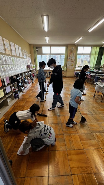 教室も廊下もたてわり班の仲間できれいにします。