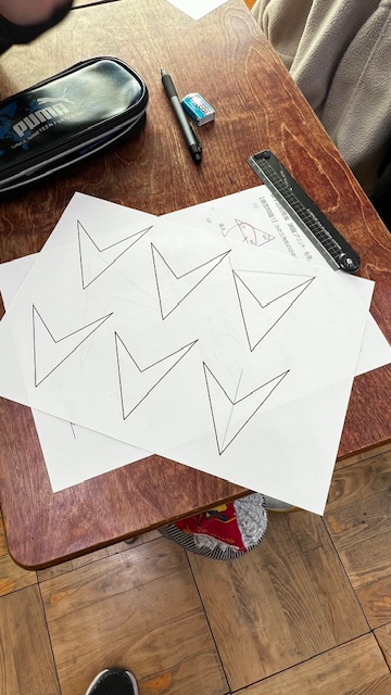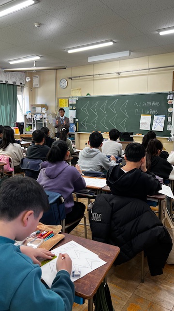 「三角形の内角の和」について復習し、「三角形の外角の定理」についても、教えてもらいました。凹四角形を三角形に分けるように線を引いたり、三角旗(スリッパ型、カタツムリ型と、子どもたちは名付けてました)の形になるように線を引きました。