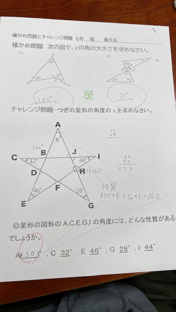 凹四角形の性質が分かったところで、他の凹四角形やねじれ四角形の角を求めます。習ったことを活用して答えを、出す段階です。