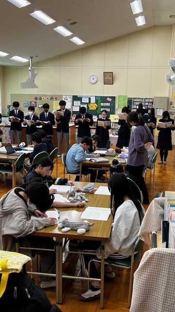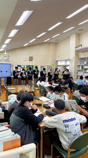 今日は、宮上中学校の生徒会のみなさんが下柚木小学校に来てくださいました。