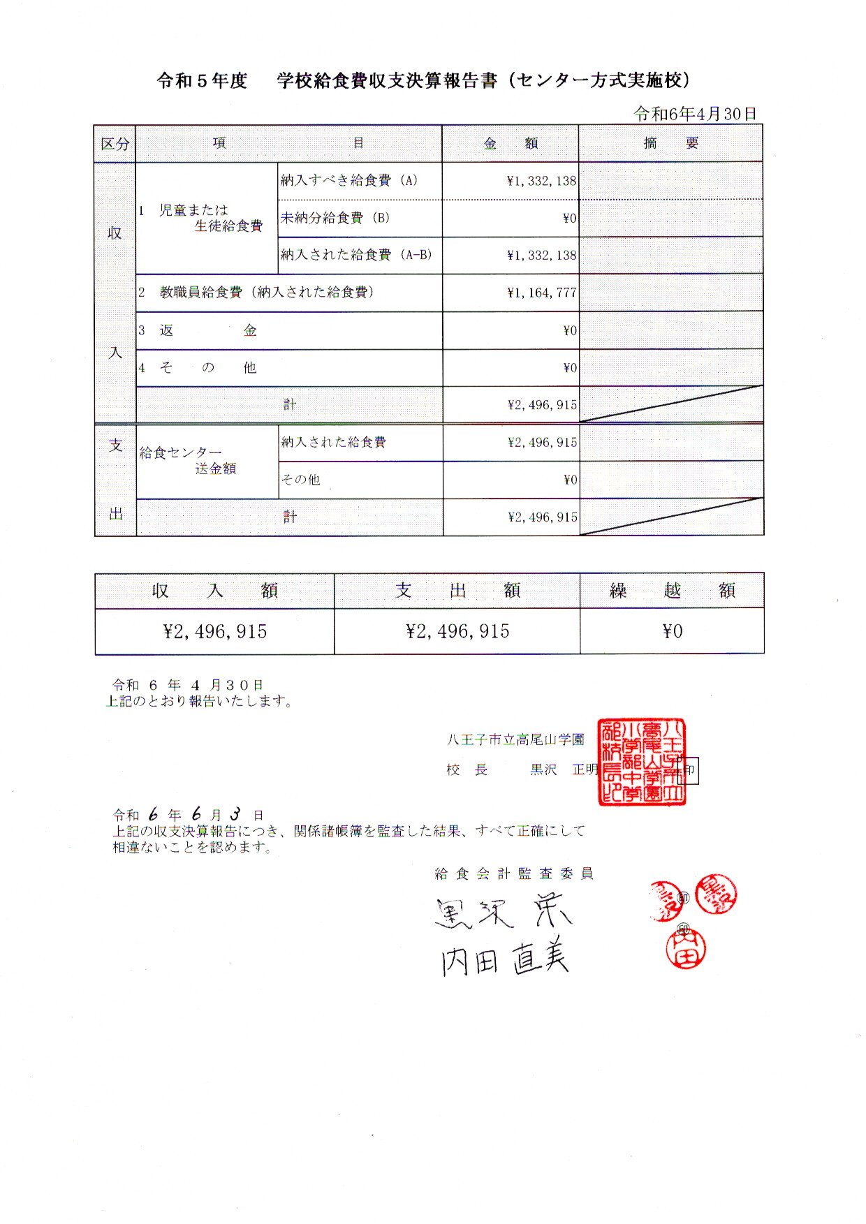 給食収支決算報告