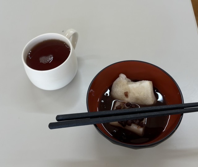クッキング講座では、お餅を焼いておしるこづくりをしました。甘くておいしいおしるこでみんなが笑顔になりました。
