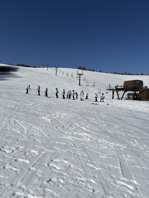 スキー教室1日目です。晴天に恵まれました。午後の2時間、スキーに挑戦しました。夕食はバイキングです。食べたいものを自分で選んで食べました。