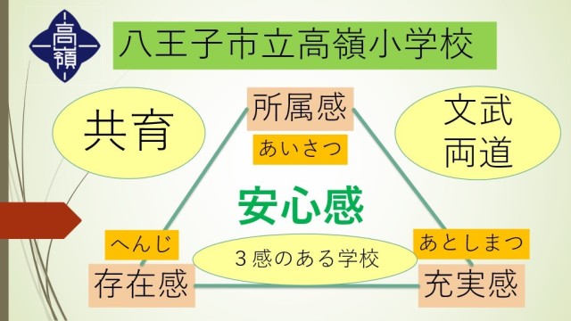 教職員が一致団結し、子どもたちの健やかな成長のために、『3感(所属感・存在感・充実感)のある学校』、『共育(保護者・地域と同じ方向を向いた教育』、『文武両道(お勉強も運動も大切に)』を常に念頭に置いた学校運営を行い、教育目標の実現を目指します。保護者・近隣の地域の皆様、ご協力のほど、よろしくお願いいたします。