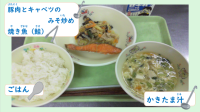今日の献立★ごはん★焼き魚(鮭)★豚肉とキャベツのみそ炒め★かきたま汁★牛乳今日...