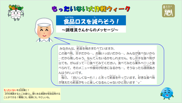 メッセージをしっかり読んで、給食も、もりもり食べて「食品ロス」を減らしましょう!
