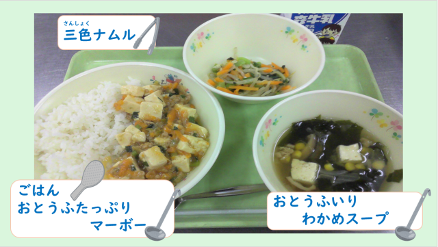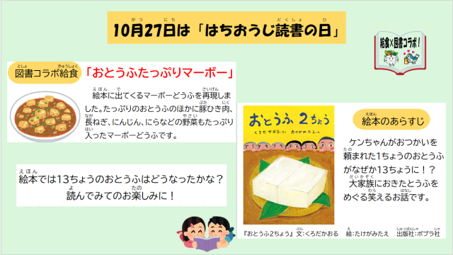 今日は「八王子読書の日」です。給食では「おとうふ 2ちょう」の絵本とコラボした献立を実施します。