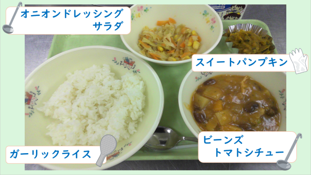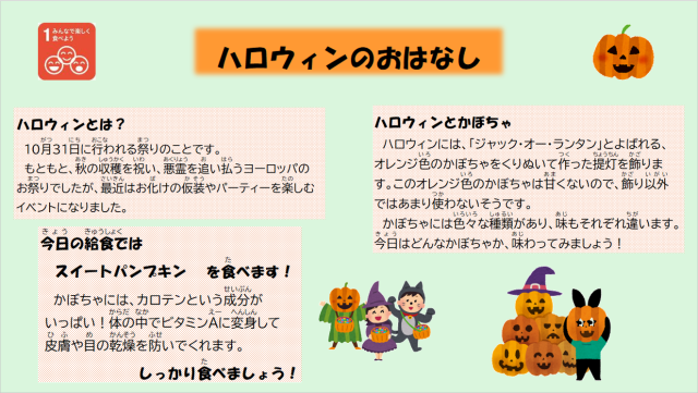 今日はハロウィンです!ハロウィンにはかぼちゃで作った「ジャック・オー・ランタン」を飾りますが、給食では、かぼちゃをおいしく調理して食べてしまいましょう!