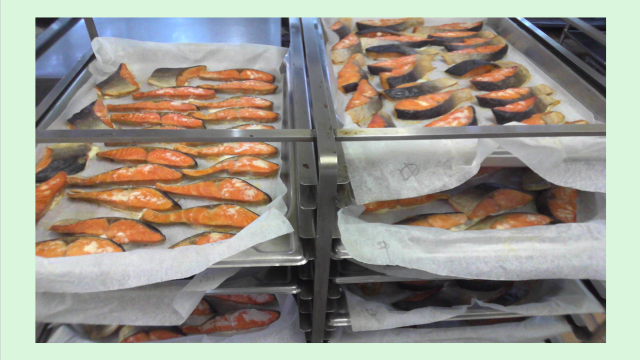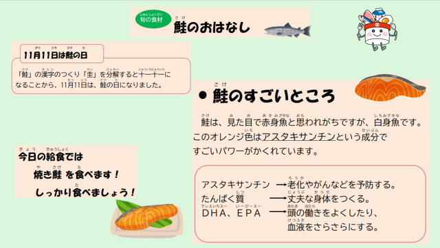 鮭 は見 た目 で赤身 の魚 と思 われがちですが、実 は白身 の魚 です。身 のオレンジ色 はアスタキサンチンという成分 で老化 やがんなどを予防 するパワーがあります。それ以外 にも、丈夫 な身体 をつくるタンパク質 も豊富 です。しっかり食 べてくださいね!