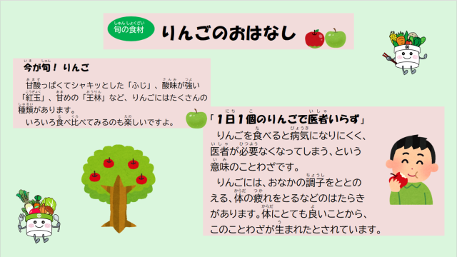 りんごには、おなかの調子を整えてくれたり体の疲れをとるなどのはたらきがあります。