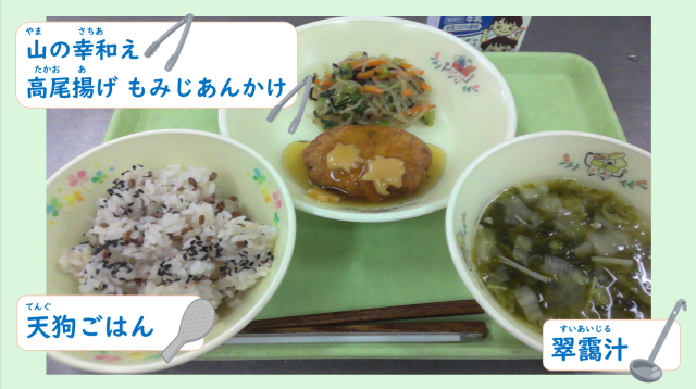 今日の献立は、高尾山が日本遺産に選ばれたことを記念して立てられた「高尾山御膳」です。