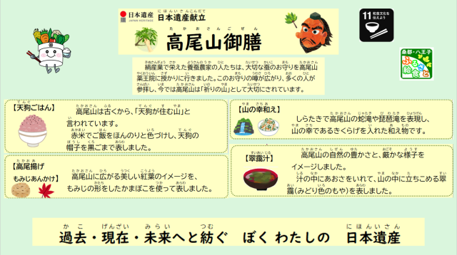 高尾山の天狗をイメージした「天狗ごはん」、高尾山の蛇滝や琵琶滝を表現した「山の幸和え」、