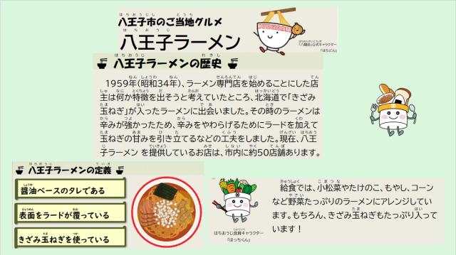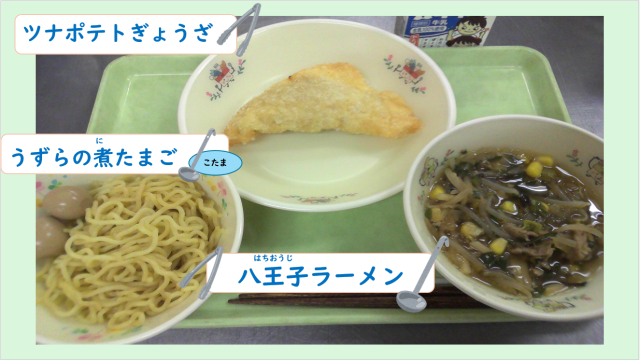 「刻みたまねぎを使っている」のが特徴です。給食では、小松菜やたけのこ、
