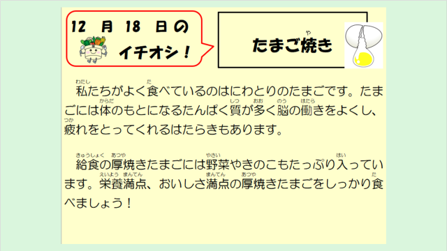 栄養満点、おいしさ満点の厚焼きたまごをしっかり食べましょう!