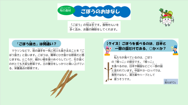 ごぼうは、冬が旬の野菜です。食物繊維を多く含み、おなかの掃除をしてくれます。今日の給食では旬のごぼうをサラダにしました。ツナやごまを入れて作ったドレッシングで和えてあります。よく噛んで食べてくださいね!