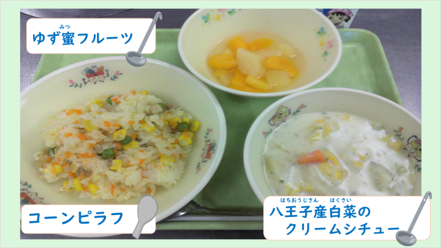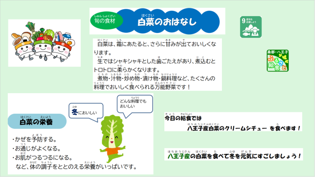 今日の給食では、旬の八王子産白菜を使って「クリームシチュー」を作りました。トロトロに煮込んだ旬の白菜を味わってください!