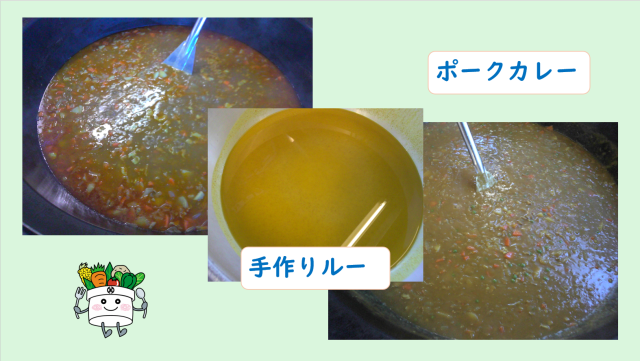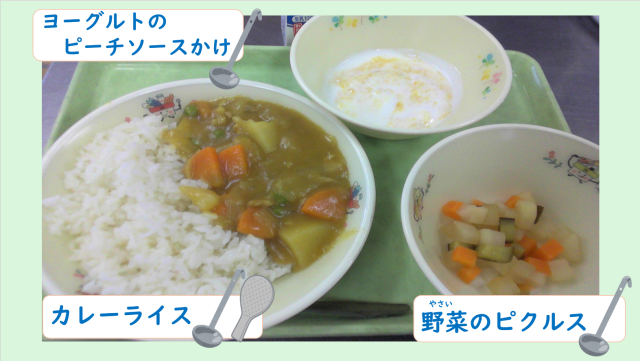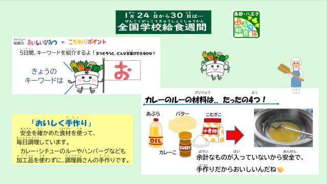 学校給食週間2日目です。今日紹介するキーワードは「おいしく手作り」の「お」です。八王子市の給食は安全を確かめた食材を使って、毎日、調理しています。カレーやシチューのルーやハンバーグやケーキも調理員さんの手作りです。今日のカレーライスもたまねぎをよく炒めてから肉と野菜を煮込み、サラダ油、バター、小麦粉、カレー粉で作ったルーを入れて仕上げました。おいしい給食を作ってくれている調理員さんに感謝していただきましょう!