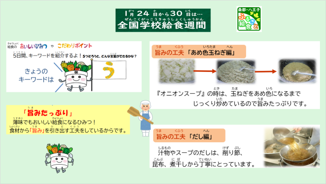 学校給食週間3日目の今日紹介するキーワードは「旨みたっぷり」の「う」です。薄味でもおいしい給食になる秘密は、食材から「旨み」を引き出しているからです。