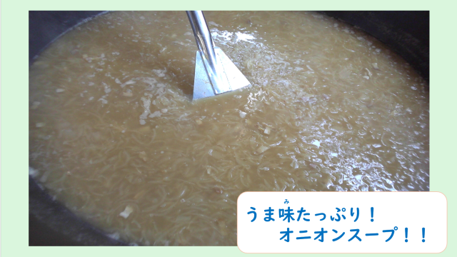 例えば、「オニオンスープ」。玉ねぎをあめ色になるまでじっくりと炒めているのでうま味とコクがアップします。また削り節からじっくりと丁寧にとった澄んだ出汁でもうま味アップです!