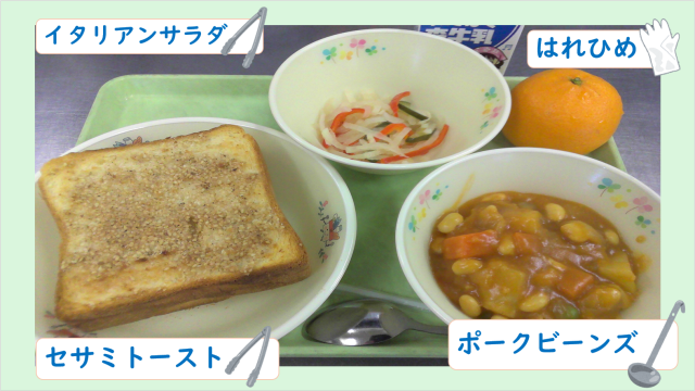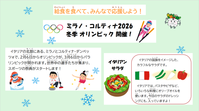 今日の給食では、カラフルなイタリアの国旗をイメージしたサラダを作りました。イタリア料理に欠かせないオリーブオイルのドレッシングで和えてあります。モリモリ食べて、遠いイタリアで頑張る選手の応援をしましょう!