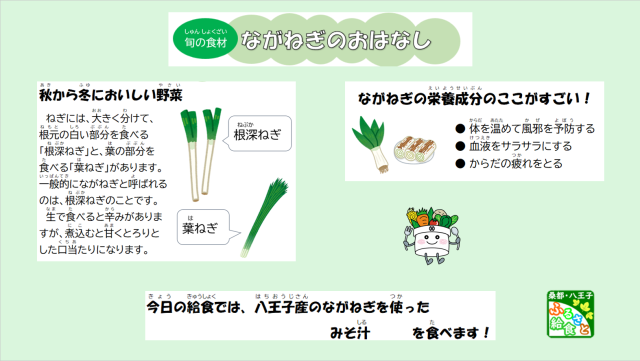 今日は旬をむかえておいしくなった「八王子産長ねぎ」をみそ汁で食べます。長ねぎには体を温めてカゼを予防したり、血液をさらさらにしたり、体の疲れをとってくれたりするはたらきがあります。苦手な人もいると思いますが、旬の長ねぎは火をとおすととても甘くとろけるようになるので、ぜひ食べてみてください!