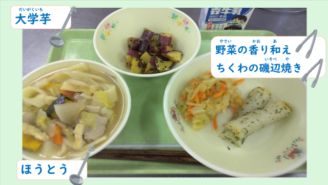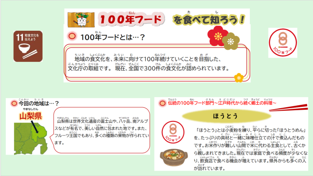 100年フードで今回食べるのは、山梨県で古くから親しまれてきた「ほうとう」です。「ほうとうは」は小麦粉を練って伸ばし、平らに切った「ほうとうめん」をたっぷりの具材と一緒にみそ味の汁で煮込んだものです。米作りの難しい山間部で米に代わる主食として古くから食べられてきました。今日の給食では、豚肉とたくさんの野菜と煮込んだ「ほうとう」を食べます。いつもの「うどん」とはちがう、幅広の「ほうとう」を味わってください!