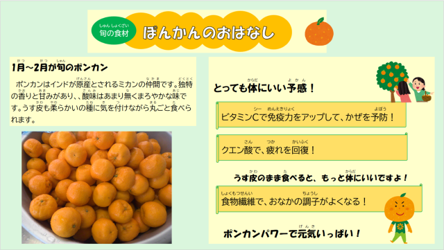 1月から2月が旬のポンカンは、インド生まれのかんきつ類です。さわやかな香りと甘みがあってが少ないので種に気を付けて、薄皮ごと食べてくださいね。ビタミンCやクエン酸が豊富なのでカゼの予防や疲れの回復に効果があります。しっかり食べて元気いっぱいに過ごしましょう!