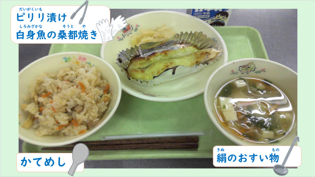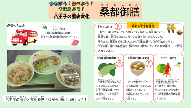 今日の給食は「桑都御膳」です。八王子で100年フードに認定されている「かてめし」と「桑都焼き」、「絹のお吸いもの」、八王子の野菜を使った「ピリリ漬け」をいただく献立です。八王子の歴史と文化を感じながら味わってください!