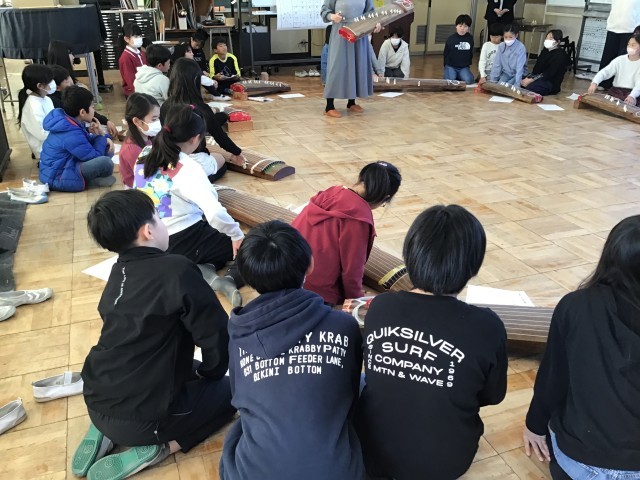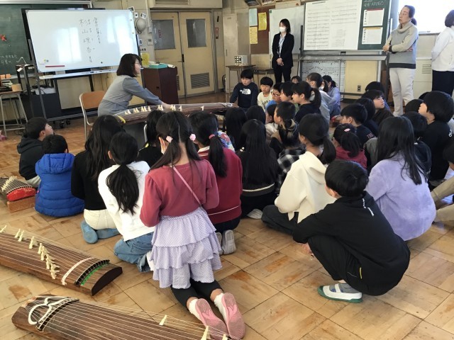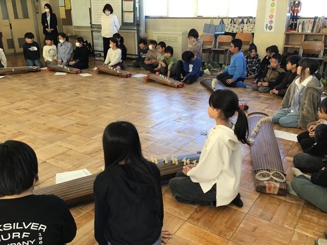 4年生は音楽の学習で箏の体験を行い、「さくらさくら」の演奏に挑戦しました。