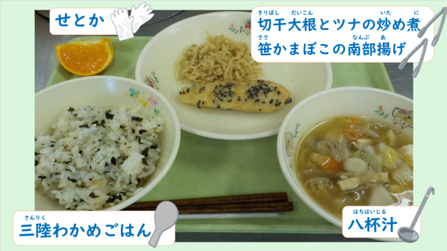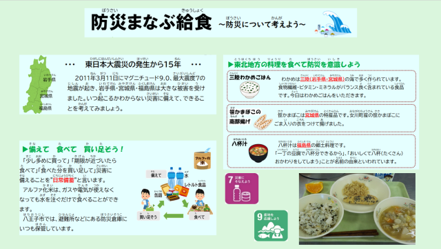 今から15年前の2011年3月11日に東北地方を震源とする大きな地震が起き、岩手県、宮城県、福島県は大きな被害を受けました。今日の給食は「防災まなぶ給食」です。東北地方の料理を食べて防災を意識し、いつ起こるかわからない災害に備えて私たちにできることを考えてみましょう。