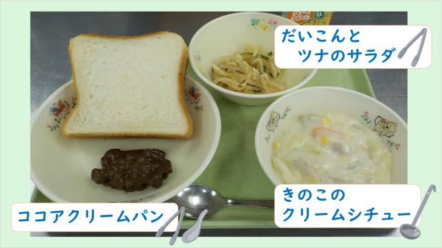 今日は、給食室で「ココアクリーム」を作りました。ピュアココアを練ってから牛乳やさとうと混ぜ、さらに練って出来上がるのがココアクリームです。ココアのほろ苦さとミルク感たっぷりの甘いココアクリームをたっぷりパンに付けて食べてくださいね!
