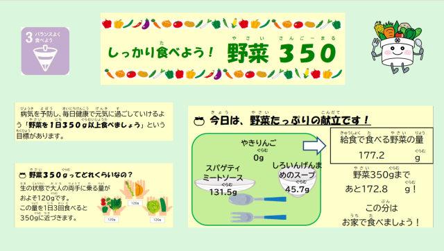 今日は「しっかり食べよう!野菜350!」の日です。病気を予防し、毎日健康で元気に過ごしていけるよう「野菜を一日350グラム以上食べましょう」という目標があります。今日の給食をしっかりひとり分べきると177.2グラムの野菜を食べることができます。しっかり食べて毎日元気に過ごしましょう!