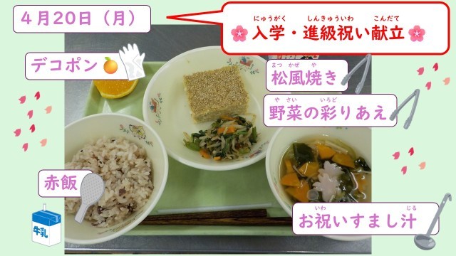 本日の給食は少し遅くなりましたが「入学・進学お祝い献立」です。