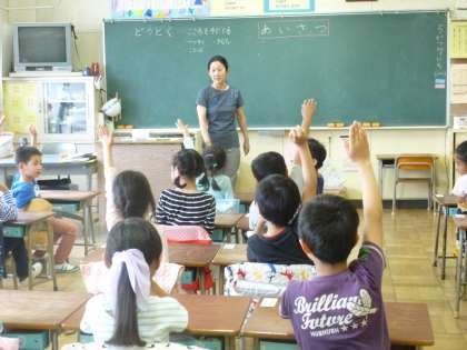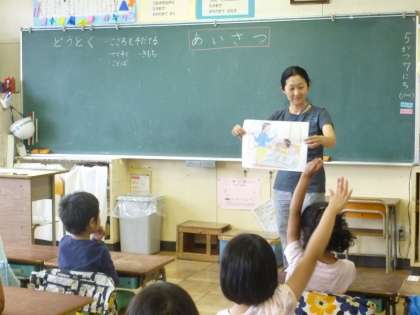1年生の道徳の授業では「気持ちのいいあいさつをしよう」の勉強をしていました。一日の生活の中で、どんな場面で、どんなあいさつをしているかを絵を手掛かりにしながら思い出します。子供たちから、
