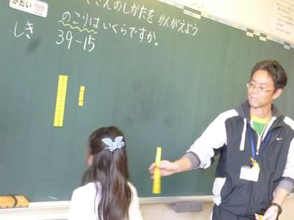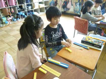 子供たちはブロックを操作しながら計算の仕方を順序立てて説明していました。こうした説明活動も、思考力や表現力をはぐくむ大切な勉強です。お友達の説明を聞いている子も、「ぼくと同じだ!」「私のやり方は、ちょっと違うよ!」と自分なりの考えを持ちながら聞いています。どの子も説明をしたり、聞いてもらったりするとき、とてもいい顔をしていました。