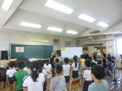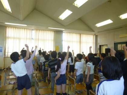 運動会の練習真っ盛りでしたので、運動会の歌「ゴーゴーゴー」の練習もしました。いつもは応援団のお兄さんたちがやっている掛け声を、今日は3年生の子供たちの立候補で決めます。