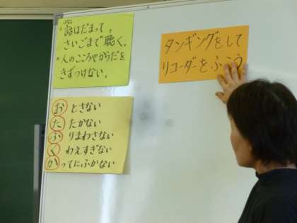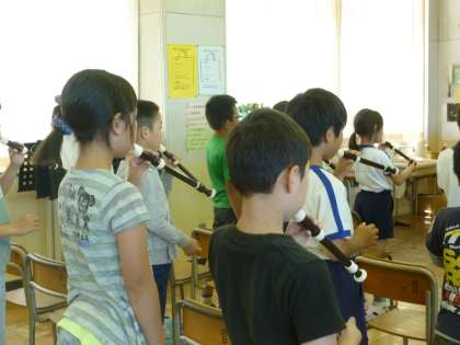 3年生からリコーダーの学習が始まります。リコーダーのを拭くときのルールや各部位の名称を確認してからみんなで練習します。