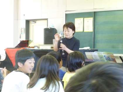 「トトロー トットコトットットー」とタンギングのコツも教えてもらい、みんなで一生懸命練習しました。練習した後は発表会です。一人ずつ、どこが良かったかを確認しながら進めていきます。音を聞き合うことも大事な勉強です。早く素敵な曲がふけるように、頑張って練習しましょうね。