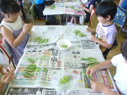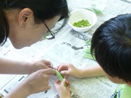 しっかりお勉強した後は、いよいよグリンピースのさやむきに挑戦です。固い皮をプチッと押すと、そこからかわいらしい緑のお豆が飛び出してきます。
