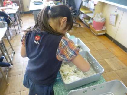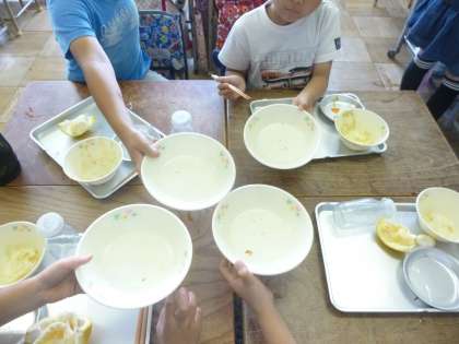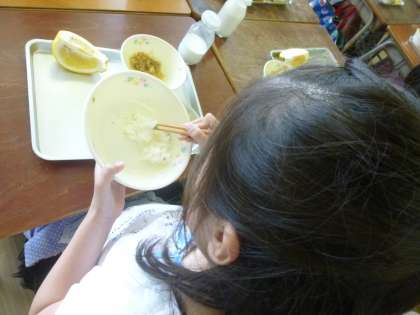 「いただきます」の後、みんな一斉にご飯に箸が向いていました。苦手意識のあった子も、今日は頑張って食べていたようです。給食の様子を覗きに行くと、空っぽになったご飯のお皿が並んでいました。