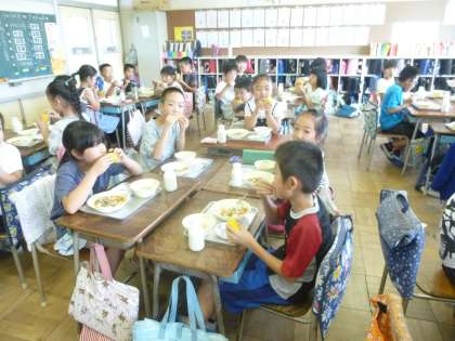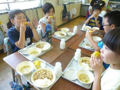 給食の時間に3年生の教室を覗いてみると、とうもろこしをおいしそうにほおばる子供たちの姿がありました。