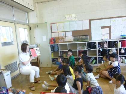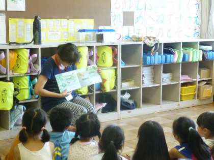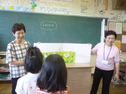 他のクラスでも読み聞かせをしていただいています。子供たちの学年や興味関心に合わせて本を選んでいただいています。大型絵本を使って読んでくださるクラスもありました。