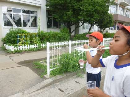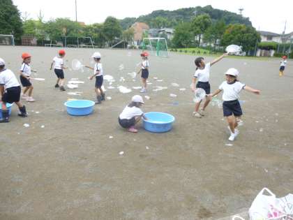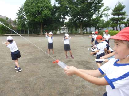 1年生の生活科「なつのあそび」で水遊びを楽しみました。マヨネーズやケチャップの空き容器を使った水鉄砲コーナーでは、容器にお水を入れて遠くまで飛ばすのを楽しんでいました。また、シャボン玉コーナーではストローやうちわの骨組みを使ってシャボン玉作りをしました。暑い一日でしたが子供たちは大はしゃぎで夏の遊びを楽しんでいました。
