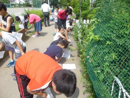 次は実際に校庭に出てアリを観察します。動き回るアリを必死で追いかけながら観察していました。