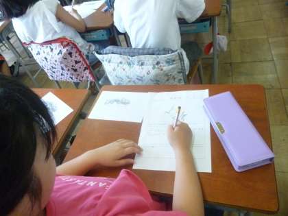 その後は教室に戻って、アリの資料なども手掛かりにしながら、気づいたことや分かったことをワークシートにまとめていきます。足の数や体の形、頭や口の形など気付いたり発見したりすることが多かったようです。