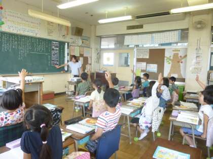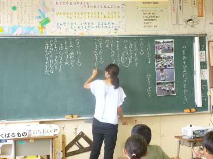 1年生の国語の時間を参観しました。「こんな ことを したよ」の単元で、「したことをわかりやすく書こう」をめあてに、作文づくりに取り組みました。先日取り組んだシャボン玉や水鉄砲遊びを思い出し、どんな様子だったか、その時、どんな気持ちだったかを出し合い、文章作りをしました。